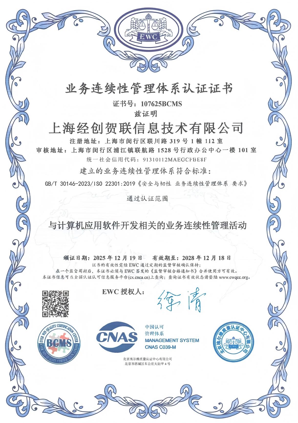 在复杂多变的市场环境与潜在风险挑战面前,企业的运营韧性与应急保障能力,是衡量其核心竞争力的关键维度。近日,上海经创贺联信息技术有限公司(以下简称:经创贺联)正式通过ISO 22301:2019业务连续性管理体系认证,获得国际权威机构颁发的认证证书,标志着公司在业务连续性管理领域已达到国际先进标准,为企业稳健发展与客户价值保障筑牢制度根基。
